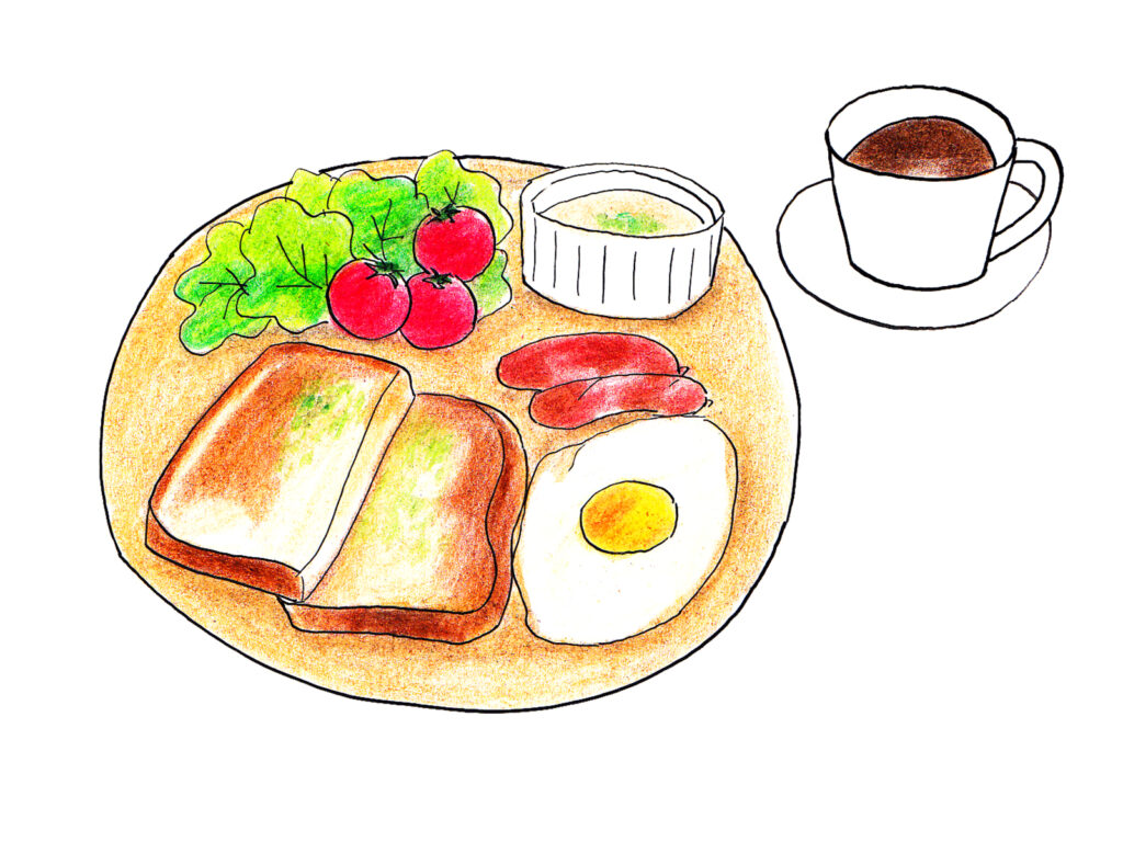 - 朝早くに出かけ、外で朝食を食べる